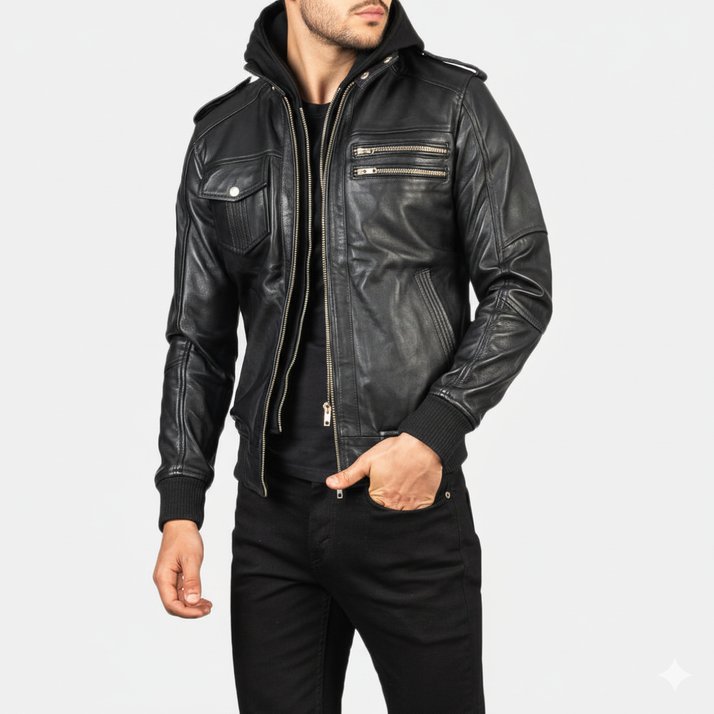 Men's Bravado Black Hooded Leather Bomber Jacket – The Jacket Maker