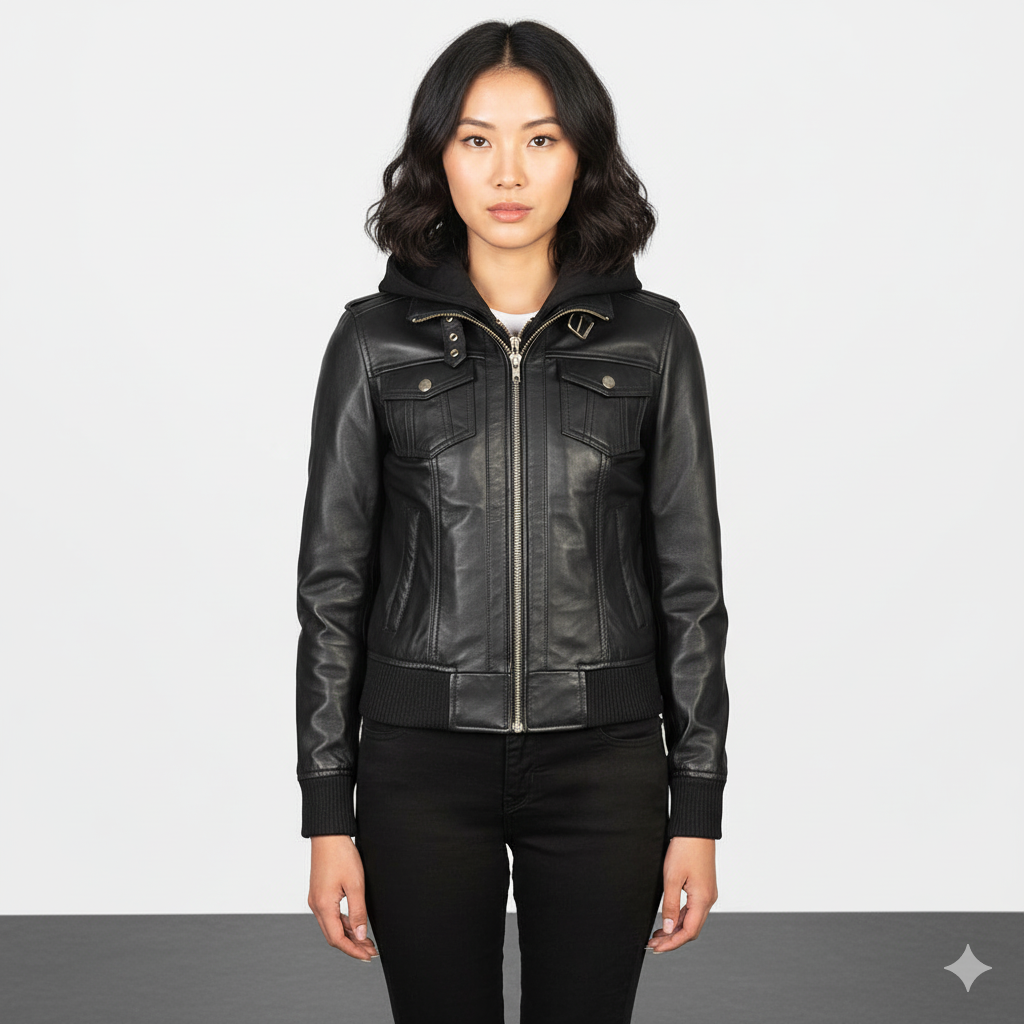 Women's Roslyn Black Hooded Leather Bomber Jacket – Noir Mode
